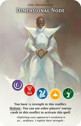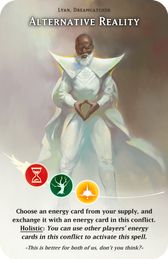 Ganzheitlich: "Du kannst gegnerische Energiekarten zur Erfüllung der Voraussetzung mitverwenden", das heißt: Energiekarten anderer Spieler werden bei der Erfüllung der Voraussetzung eines Spruches genau so behandelt wie eigene Energiekarten. Du darfst einen Spruch sogar dann aktivieren, wenn du keine einzige Energiekarte in den Konflikt gespielt hast, solange deine Gegner zusammen die passende Farbkombination gespielt haben.