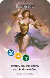 Eine beliebige Karte: Du darfst wählen, welche Energiekarte du mit diesem Spruch treffen möchtest - egal ob eigene oder gegnerische Karte. Weil dabei Farbe und Stärke der Karte keine Rolle spielen, darfst du auch eine verdeckte Karte wählen.