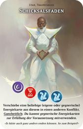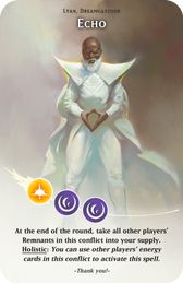Ganzheitlich: "Du kannst gegnerische Energiekarten zur Erfüllung der Voraussetzung mitverwenden", das heißt: Energiekarten anderer Spieler werden bei der Erfüllung der Voraussetzung eines Spruches genau so behandelt wie eigene Energiekarten. Du darfst einen Spruch sogar dann aktivieren, wenn du keine einzige Energiekarte in den Konflikt gespielt hast, solange deine Gegner zusammen die passende Farbkombination gespielt haben.