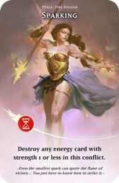 Eine beliebige Karte: Du darfst wählen, welche Energiekarte du mit diesem Spruch treffen möchtest - egal ob eigene oder gegnerische Karte. Weil dabei Farbe und Stärke der Karte keine Rolle spielen, darfst du auch eine verdeckte Karte wählen.