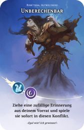 Was ist eine zufällige Karte?: Eine zufällige Karte ist eine Karte, die auf beliebige Weise zufällig ausgewählt wurde. Wenn es um eine zufällige Handkarte geht, könntest du zum Beispiel einen anderen Spieler bitten, eine Karte zu ziehen. Wenn es um eine zufällige Karte aus deinem Vorrat geht, solltest du den Vorrat mischen und dann eine ziehen. In der Regel bezieht sich "zufällige Karte" glücklicherweise auf einen bestimmten Kartentyp, also zum Beispiel "eine zufällige Erinnerung". Welche Karten Erinnerungen sind, kannst du an der Rückseite erkennen. Falls eine zufällige Karte aus Karten mit unterschiedlicher Rückseite gewählt werden soll, solltest du dir vor dem Mischen zum Beispiel die Augen verbinden. Gibt es nur eine Karte, aus der du eine zufällige wählen sollst, dann ist es diese eine Karte. Sollst du im Casual Chaos - Modus eine zufällige Karte aus deinem Vorrat ziehen, dann ziehe einfach die oberste Karte deines Ziehstapels.
