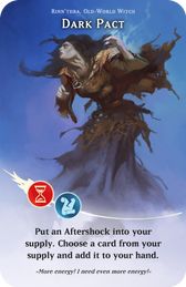 Aftershock: Aftershocks are special energy cards of Rinn'thra. Even with Aftershocks in your supply, you never take more than the usual number of cards in your hand (usually seven). Aftershocks must be taken first, before Artifacts. For example, if you already have two Aftershocks in your supply and have won six Artifacts, one Artifact of your choice remains in your supply. You don't play with eight cards.